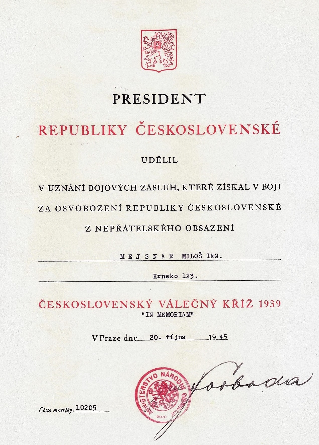 - Vyznamenání prezidenta republiky Ludvíka Svobody, z 20. 10. 1945, IN MEMORIAM, Ing. Miloši Mejsnarovi, Krnsko 123